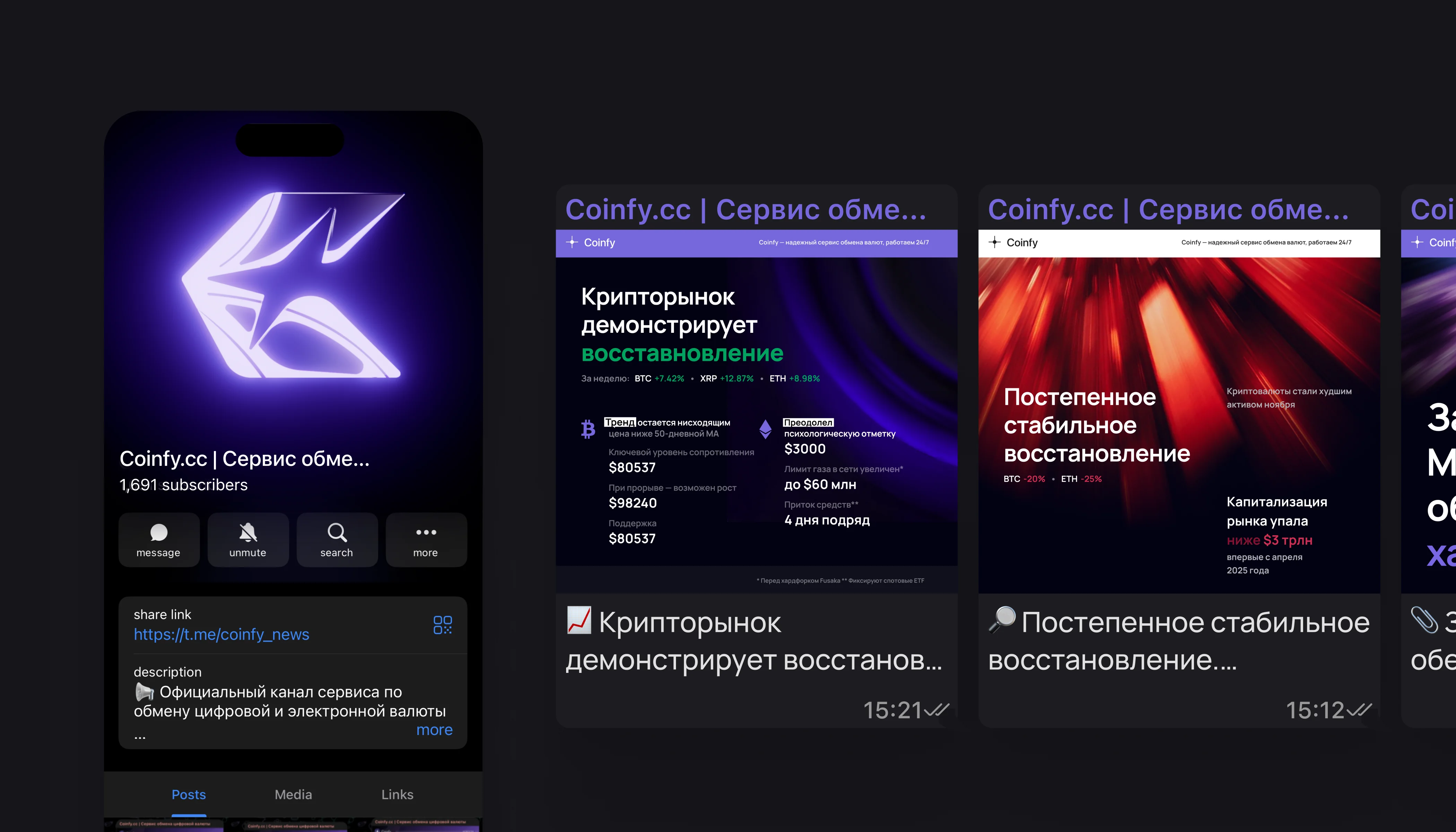 CoinFy — B2C-криптообменник без приложения и без работы с юрлицами. Основные точки контакта с пользователем — сайт, реклама и Telegram. В этой категории клиенты особенно чувствительны к деталям: важны прозрачные курсы, быстрый отклик поддержки и понятный статус заявки на каждом шаге. Команда CoinFy описывает себя как бодрый, надёжный и прозрачный сервис и хотела усилить узнаваемость бренда, не ломая привычный для пользователей образ.